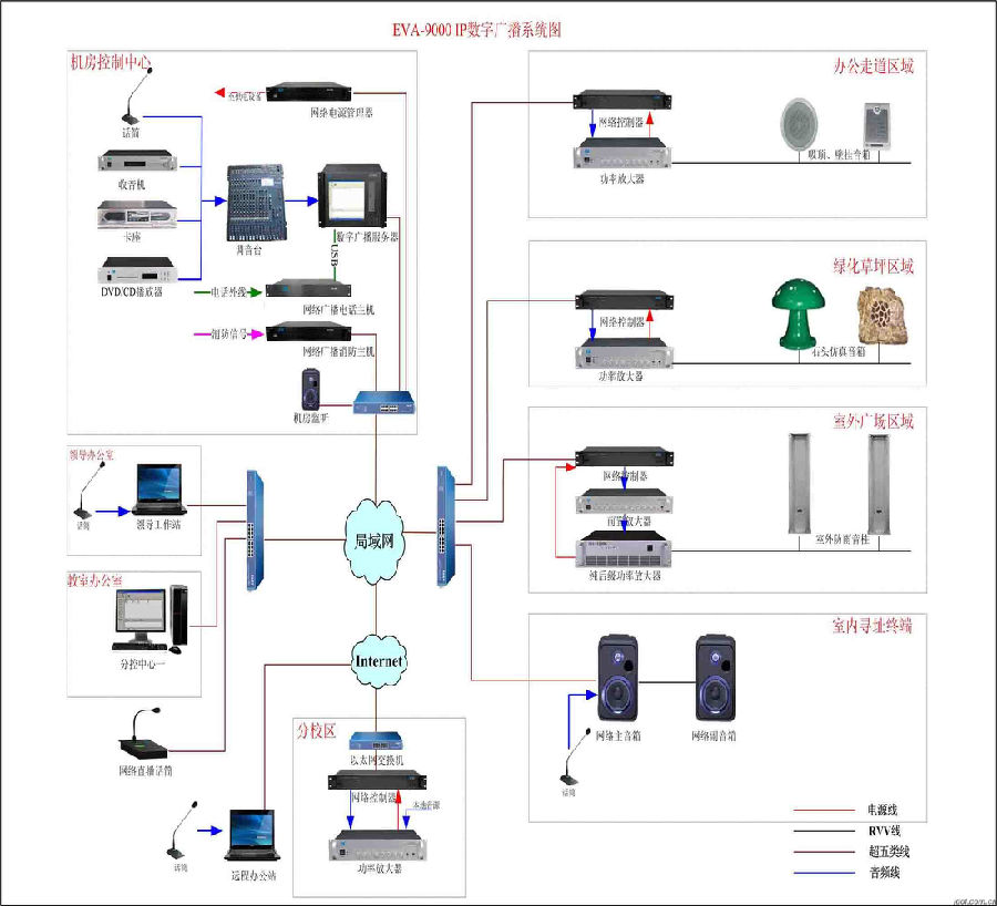 本设计是根据项目单位的要求,综合吸取当前国内公共/消防广播系统的先进技术,参照国家有关声学标准及公共广播系统设计要求,依据校园的建筑布局和使用功能要求,设计成设备先进、格调高雅、音质优美、功能齐全的现代化公共/消防广播系统。所配置的主要设备均选用EVA品牌以确保高超的性能指标,拟订系统总体设计方案如下: